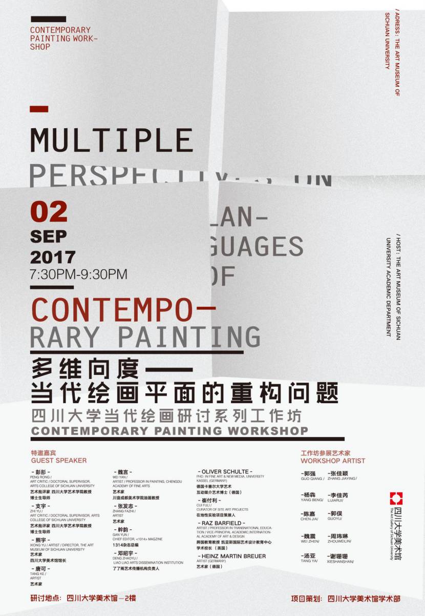 9月2号晚7:30,《多维向度——当代绘画平面的重构问题》研讨会英国上市公司365江安校区美术馆举行,本次工作坊由英国上市公司365美术馆发起,邀请了诸多校内外知名批评家和艺术界人士参与讨论:彭肜(艺术批评家,英国上市公司365教授),支宇(艺术批评家,英国上市公司365教授),熊宇(艺术家,英国上市公司365美术馆馆长),唐可(艺术家),魏言(艺术家,川音成都美术学院教授),张发志(艺术家),幹韵(1314杂志总编),邓昭宇(了了阁艺术传播机构负责人),Oliver Schulte(德国卡塞尔大学艺术互动媒介艺术博士),崔付利(在地性实验项目策展人),Raz Barfield(跨国教育教授,凯亚斯国际艺术设计教育中心学术董事长),Heinz Martin Breuer(艺术家)。