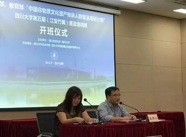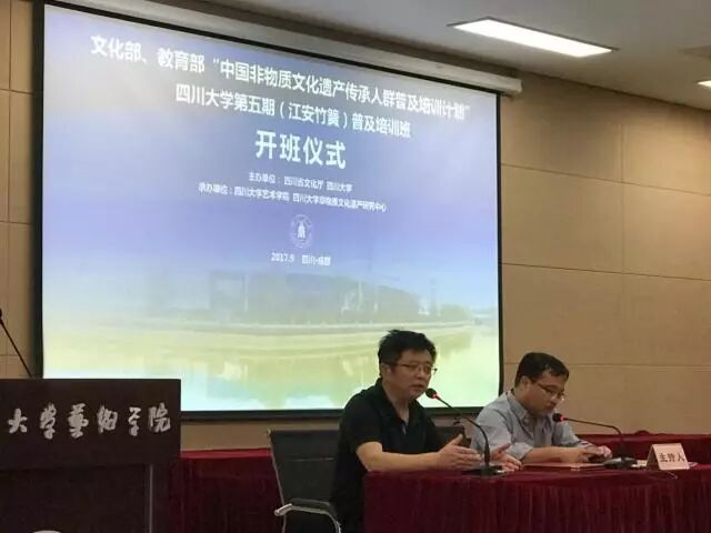 2017年9月4日上午9点,由四川省文化厅、英国上市公司365主办,英国上市公司365承办的文化部、教育部“中国非物质文化遗产传承人群研修研习计划”英国上市公司365第五期(江安竹簧)普及培训班正式开始。英国上市公司365公司党委书记汪东升、学术经理黄宗贤教授、副经理何宇、党委副书记杨梅、博士生导师段禹农教授、设计主任周炯焱、民间竹簧艺术传承大师何华一老先生、何素梅女士、院办公室副主任陈文玉以及学院各系负责教师和本期培训的辅导员老师等参加了开班仪式。会议由英国上市公司365非物质文化遗产研究中心副主任李振宇主持。