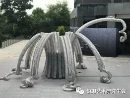 该作品以纪念碑的提炼呈现出一种有机的转化和运动,由电脑控制电机给装置充气使其形态改变。如同展开的花朵、迸发的岩浆、激流的泉水。是一种生命力量的体现,其间发出有节奏的“噗嗤”声喻示着心脏的脉动。同学们与奇科·马克姆特利畅所欲言,他分享了他的成果与书目给大家,虽然语言交流有些许障碍,但是大家对于艺术的热爱打破了这一隔阂。